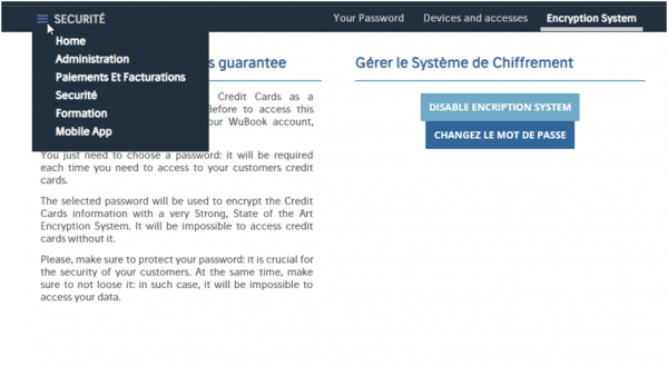 Accédez à Wubook, sur la page d’accueil, cliquez sur “Sécurité/ Système de chiffrement”.