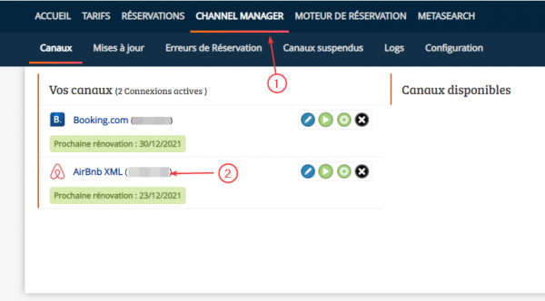 Sélectionnez l'option Channel Manager 1 / Canaux et cliquez sur le canal AirBnb 2