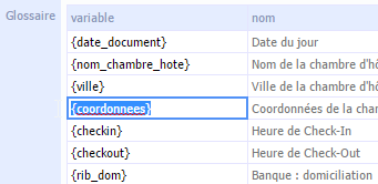 - Pour intégrer une variable dans votre document, saisissez-la directement avec ses accolades ou sélectionnez-la dans le glossaire 2 en double-cliquant sur la variable et en la sélectionnant avec la souris, puis réalisez un copier/coller dans votre document.
