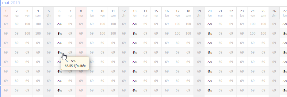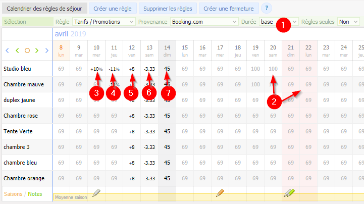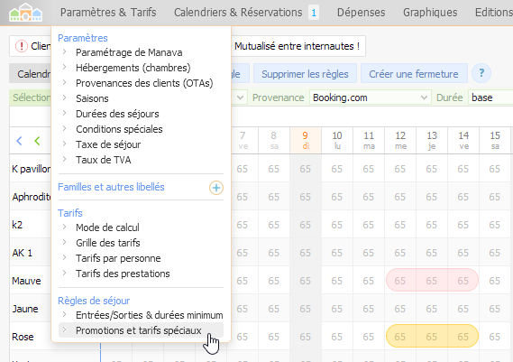 Pour saisir une promotion ou un prix spécial, cliquez sur une des cases du calendrier ou sur le bouton “Créer une règle”.
