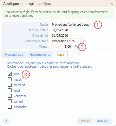 Sélectionnez la règle “Promotions/tarifs spéciaux” 1 puis la période sur laquelle appliquer cette règle.
