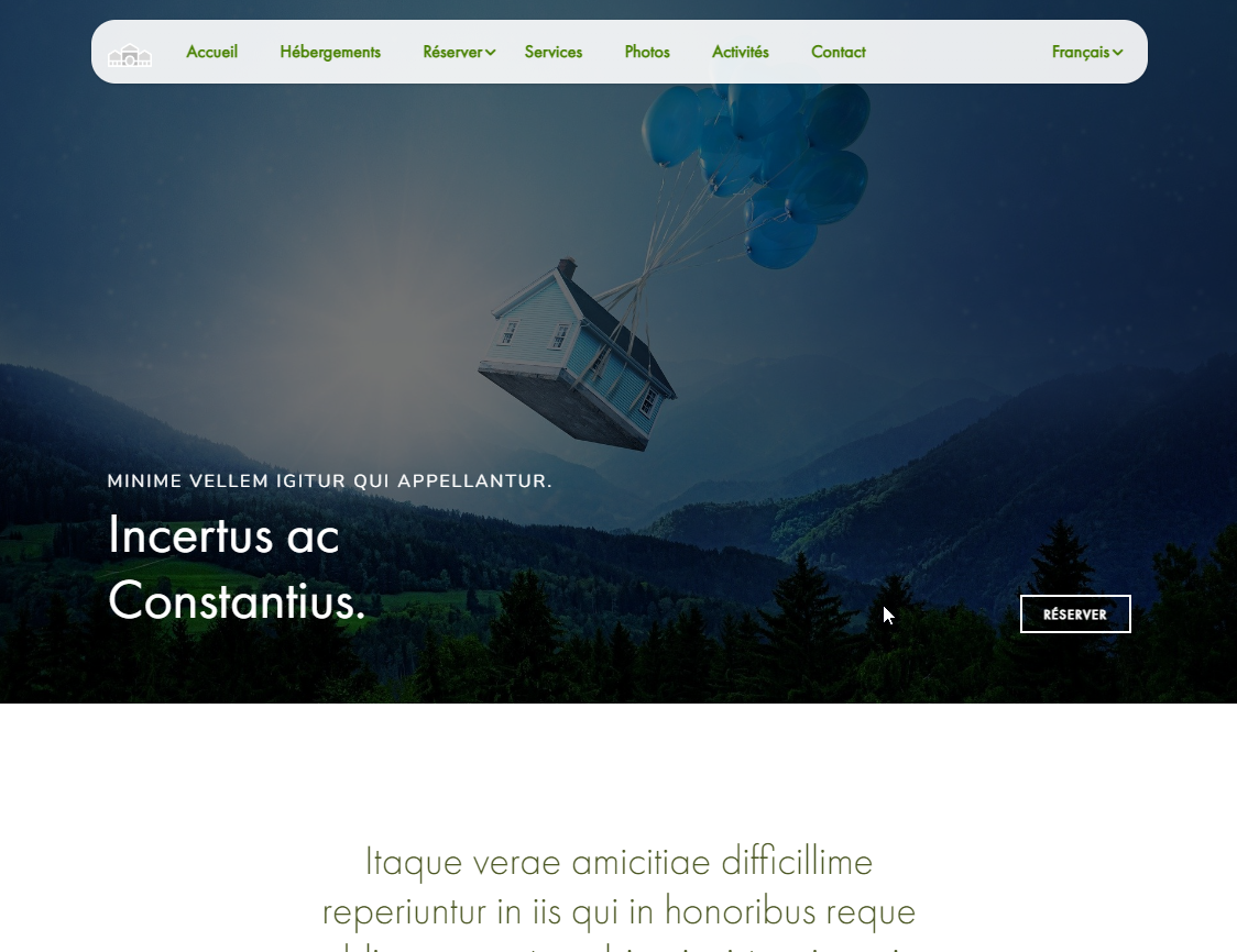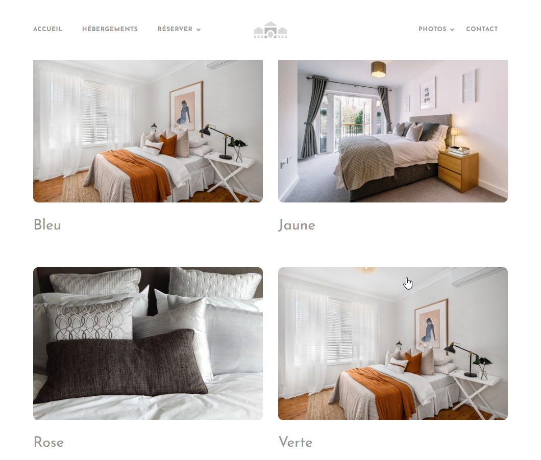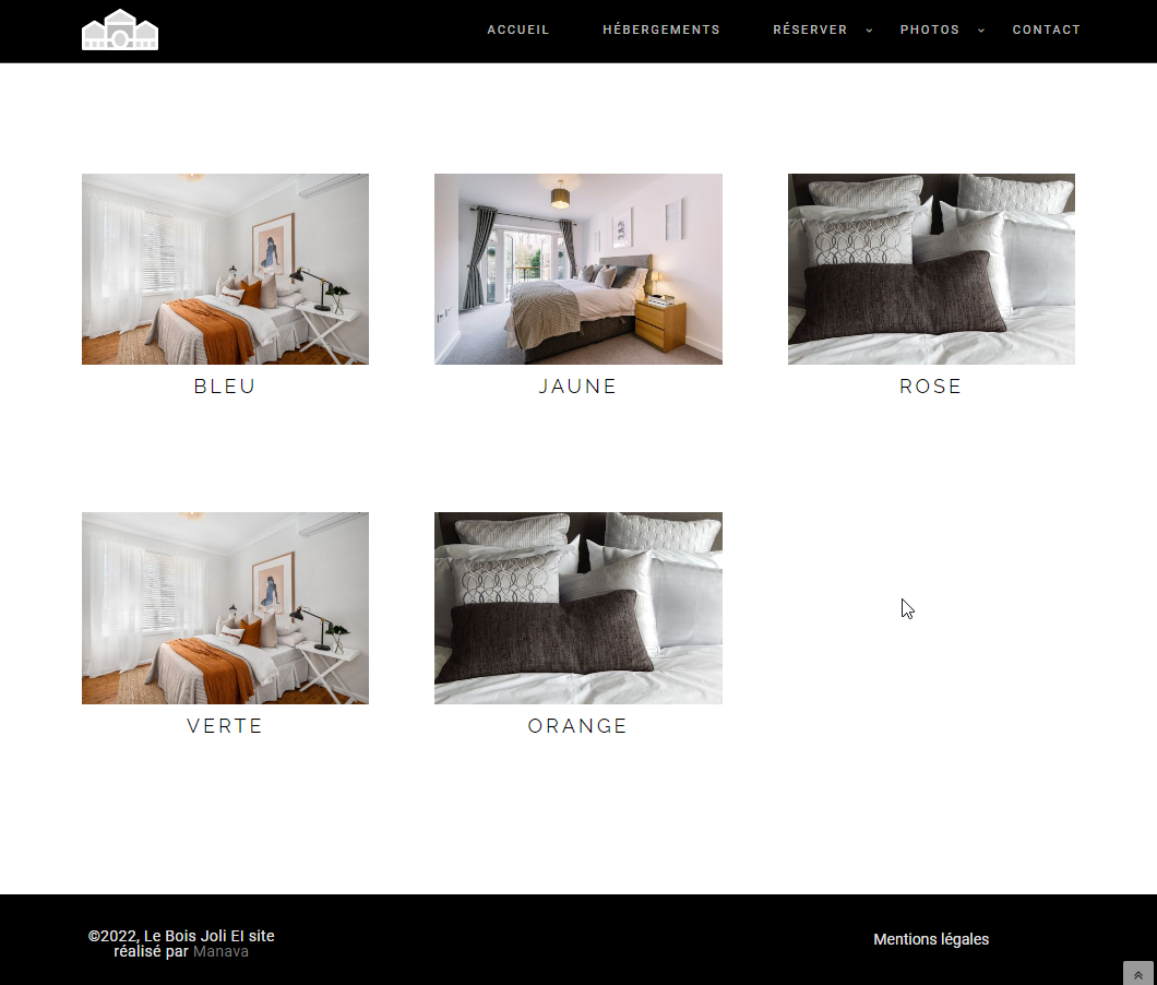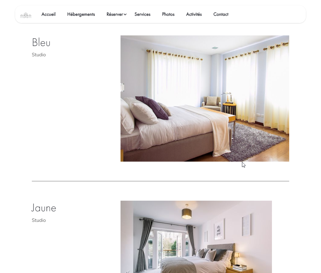 10 pages : accueil, hébergements, une page par hébergement, tarifs, réserver, services, photothèques, activités, contact, mentions légales.