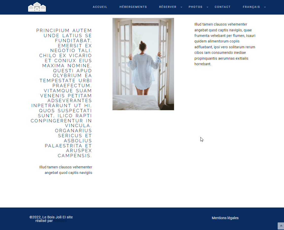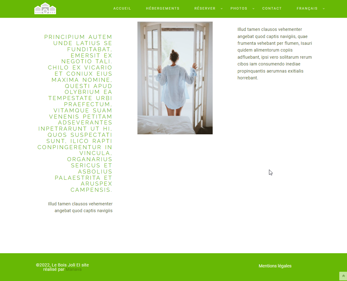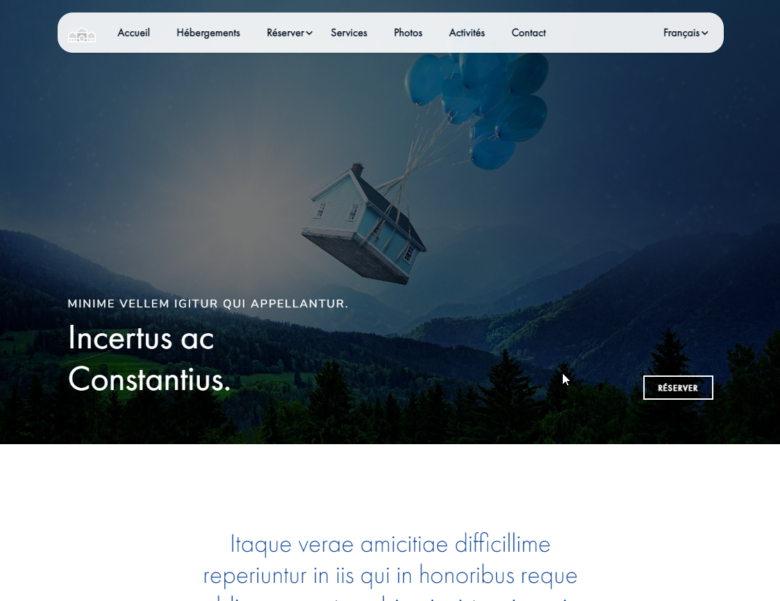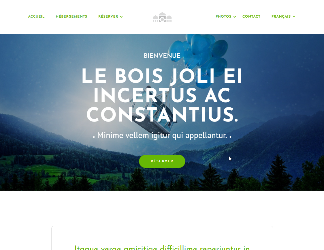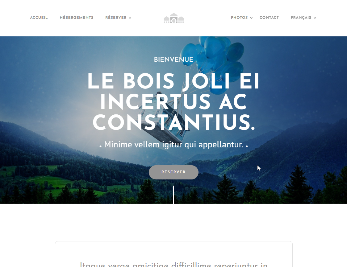 10 pages : accueil, hébergements, une page par hébergement, tarifs, réserver, services, photothèques, activités, contact, mentions légales.