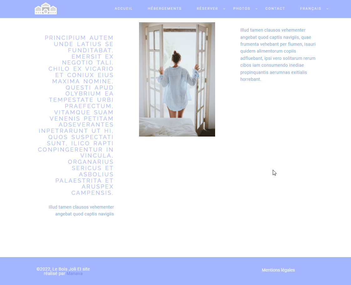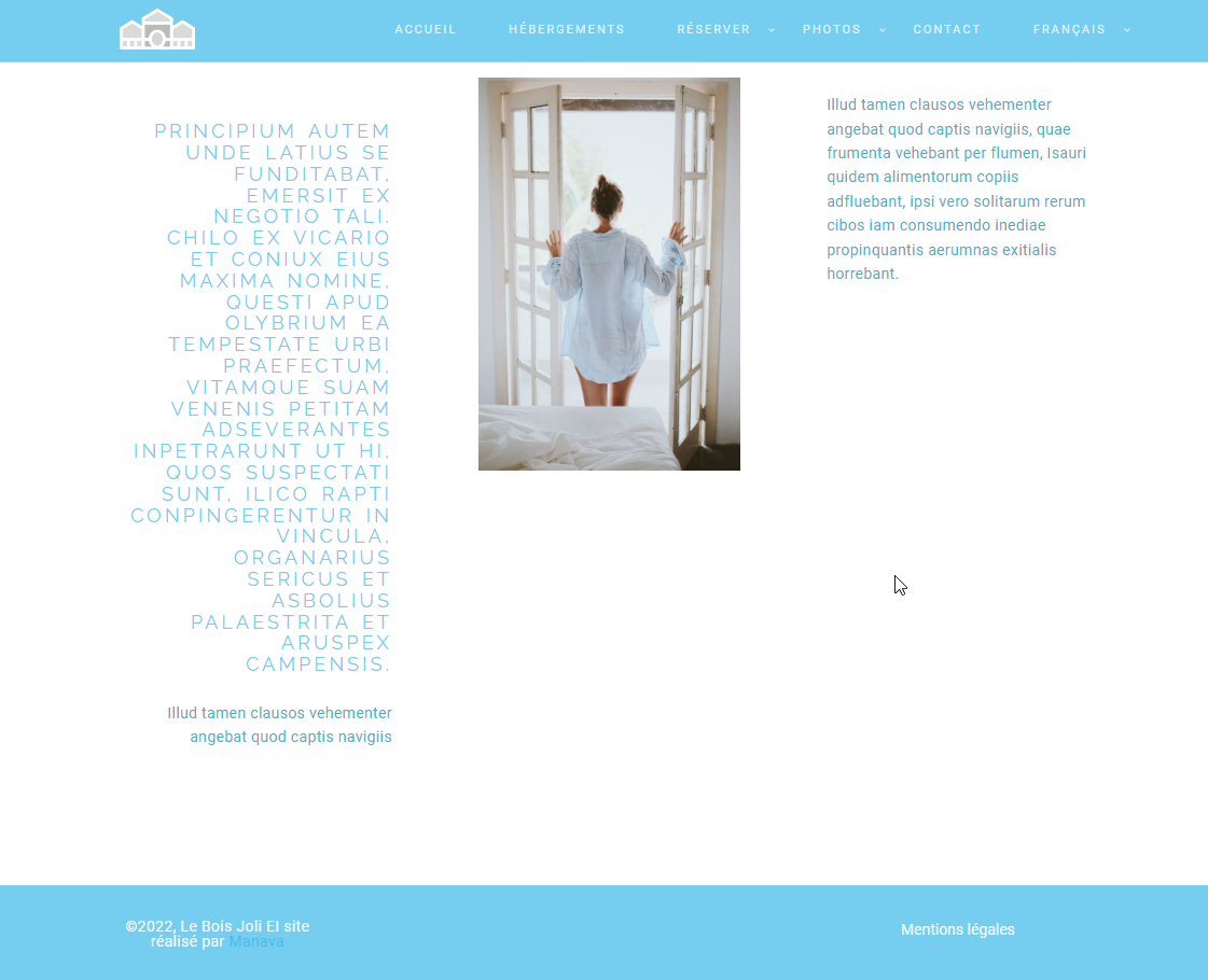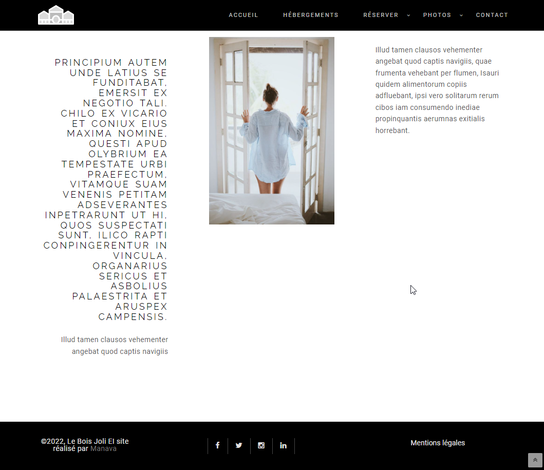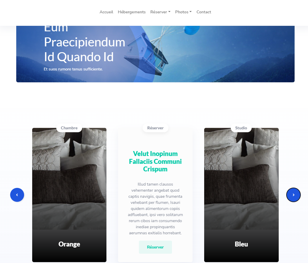 10 pages : accueil, hébergements, une page par hébergement, tarifs, réserver, services, photothèques, activités, contact, mentions légales.